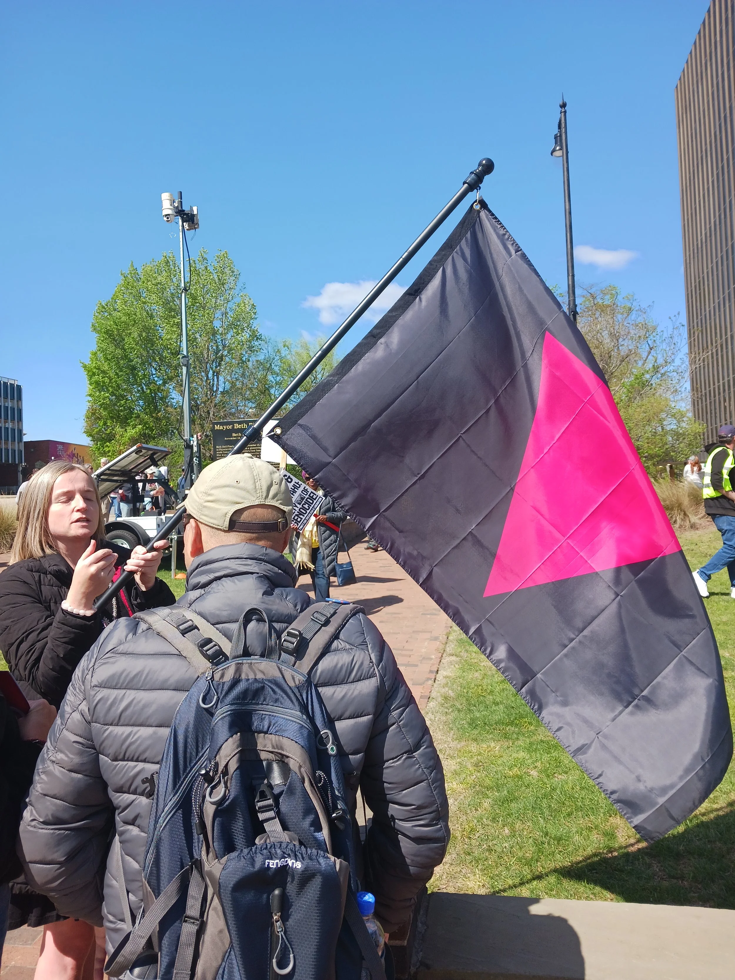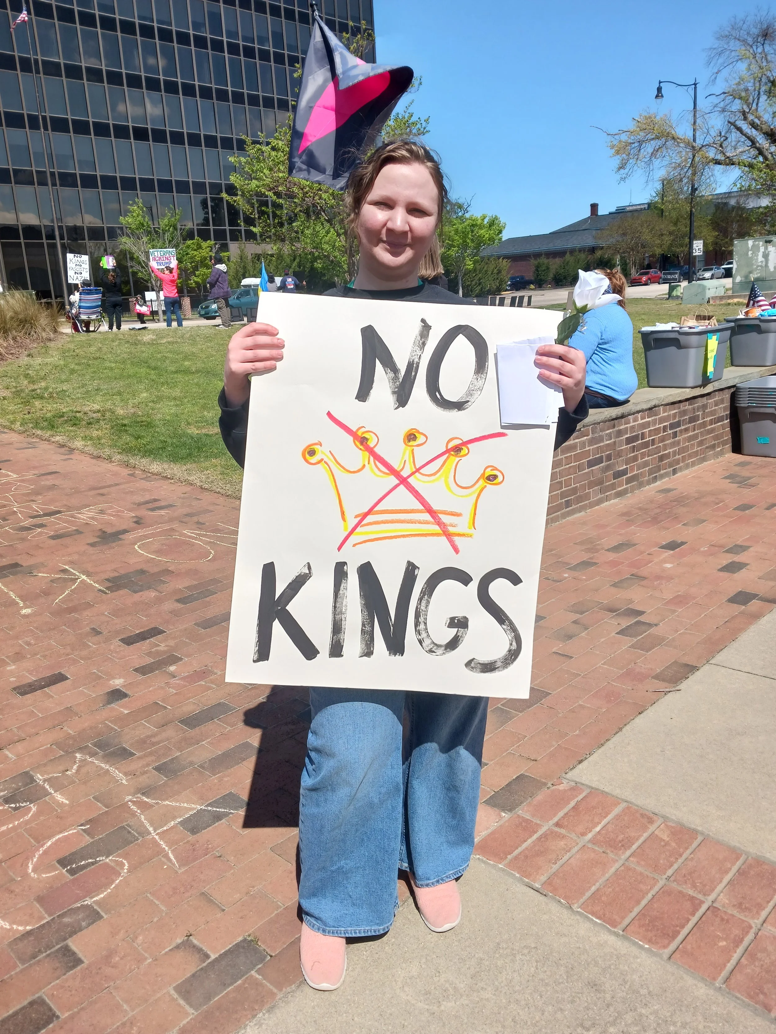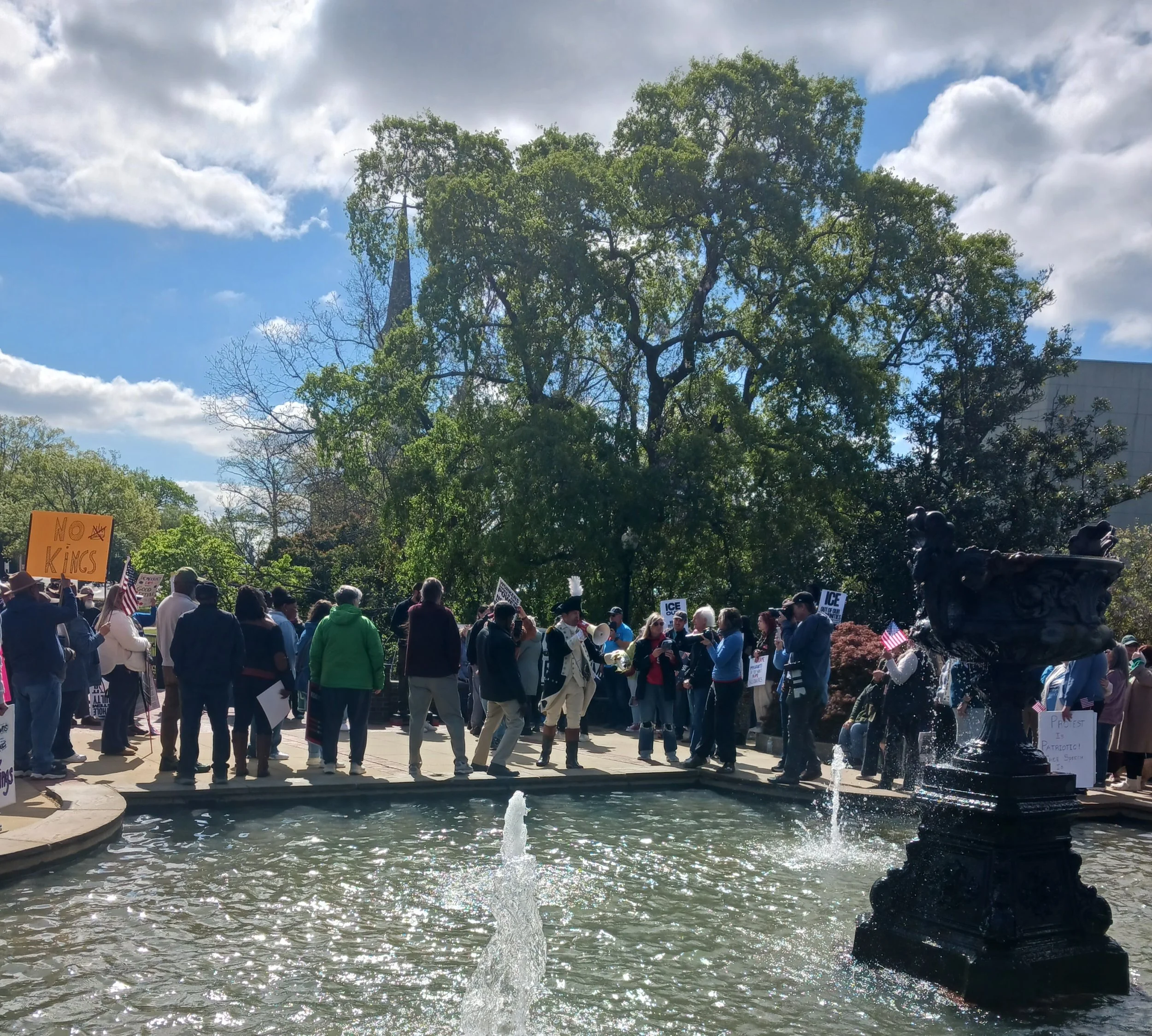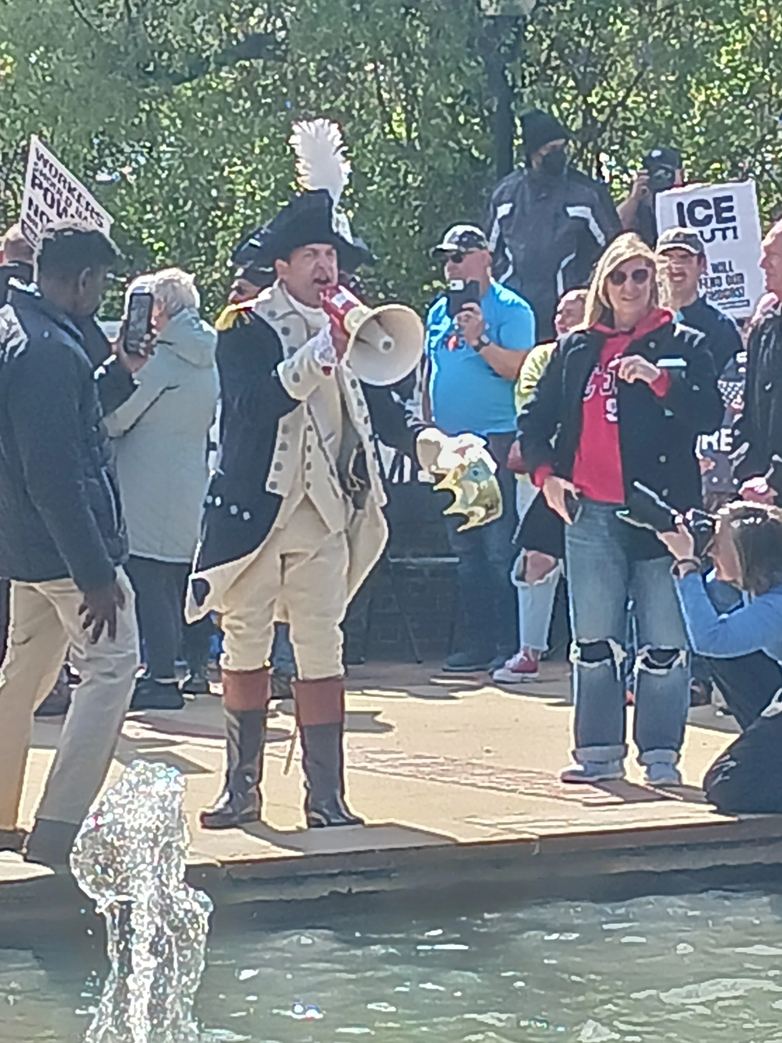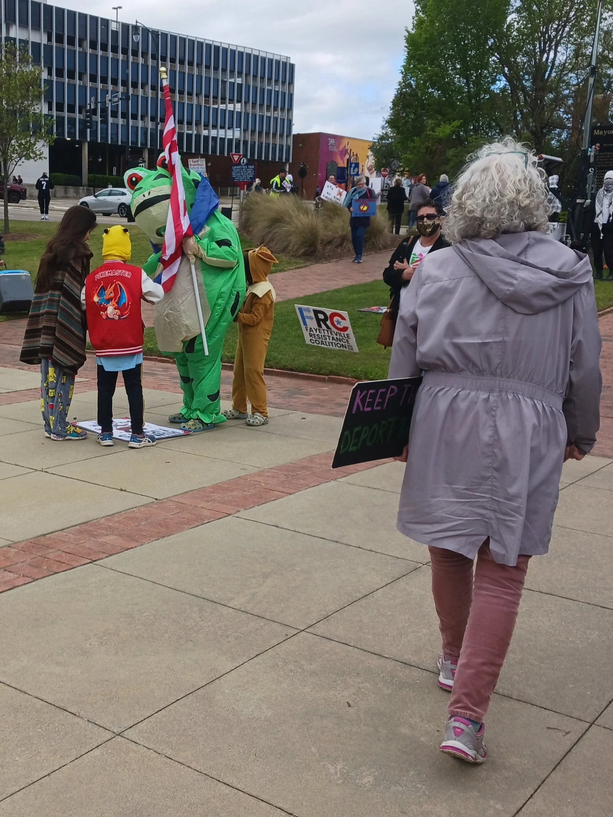 The day started cold and overcast. Though largely white and older, we were an eclectic bunch in message, there to protest various wars (Ukraine, Iran and Israel presently), others to advocate for healthcare, to release the Epstein files, tax the wealthy, fight for disability, LGBTQ+, and immigrant rights, there to show younger generations the importance of turning up when the adults tasked to protect our interests have decided to sit on their hands, further enabling the destructive impulses of a man so perfectly emblematic of all that is rotten and noxious about our country. A woman passed out white artificial roses for Palestine while someone else dressed in an inflatable frog suit twerked on the sidewalk for passing cars to honk in joyful and absurd solidarity.